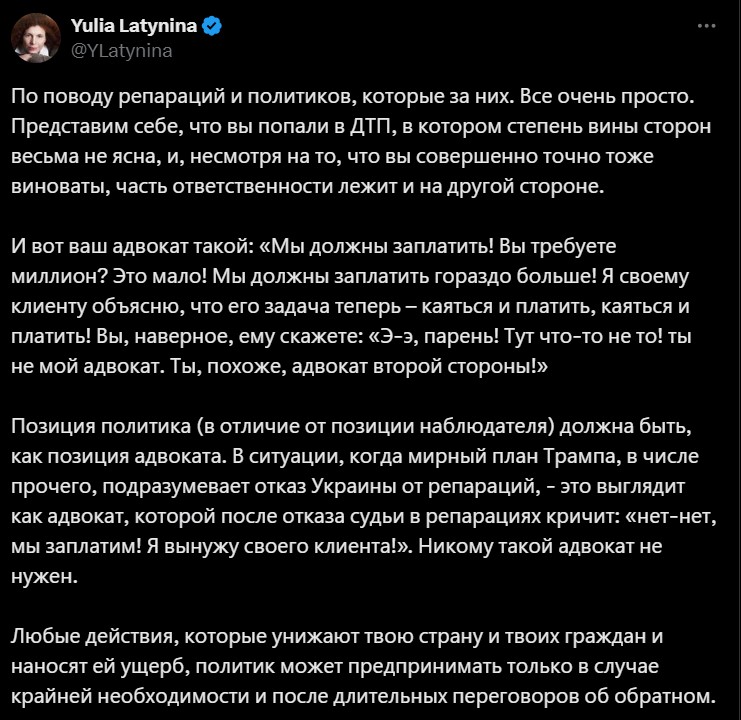 "З приводу репарацій і політиків, які за них. Все дуже просто. Уявімо, що ви потрапили в ДТП, в якому ступінь провини сторін вельми не зрозумілий, і, попри те, що ви точно теж винні, частина відповідальності лежить і з іншого боку", - написала Латиніна.