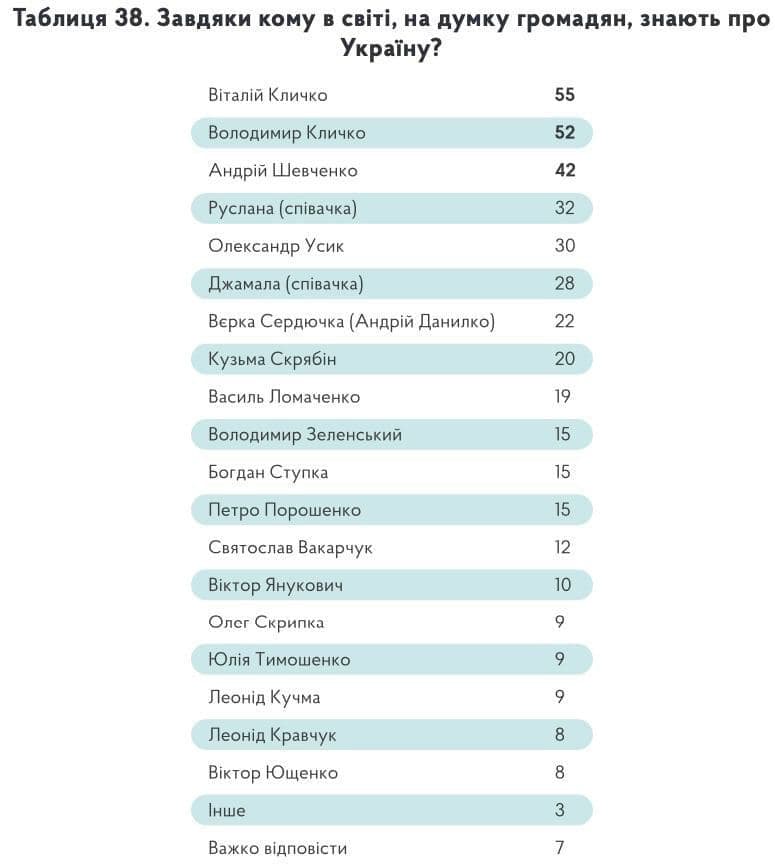 До ТОП-10 всесвітньо відомих українців увійшли також співачка Руслана - 32%, боксер Олександр Усик - 30%, співачка Джамала - 28%, Вєрка Сердючка (Андрій Данилко) - 22%, музикант Кузьма Скрябін - 20%, боксер Василь Ломаченко - 19% та президент Володимир Зеленський - 15%.