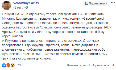 Пізніше те, що відбувається прокоментував народний депутат Олексій Гончаренко: "Кілька днів назад Ситника визнали корупціонером. Я підняв це питання в Раді і вимагав його звільнення. У відповідь НАБУ прийшло з обшуком на телеканал, яким володіє мій друг і заступник в обласному осередку Європейської Солідарності Михайло Шмушкович. Збіг? Не думаю. Ситник, вислужитися перед Зеленським не вдасться! Ми зробимо все, щоб тебе звільнили. Корупціонер не може очолювати антикорупційні органи".