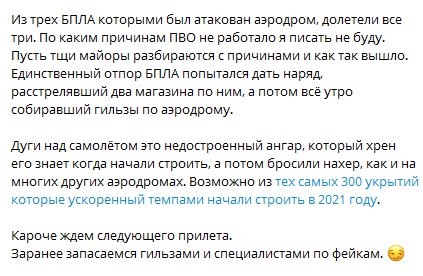 Російські пабліки повідомляють, що з трьох БПЛА, якими був атакований аеродром, долетіли всі три.
