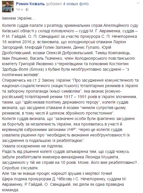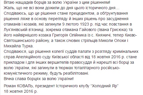 Також Роман Коваль опублікував відеозвернення з приводу реабілітації українським судом лідерів Холодноярської республіки.