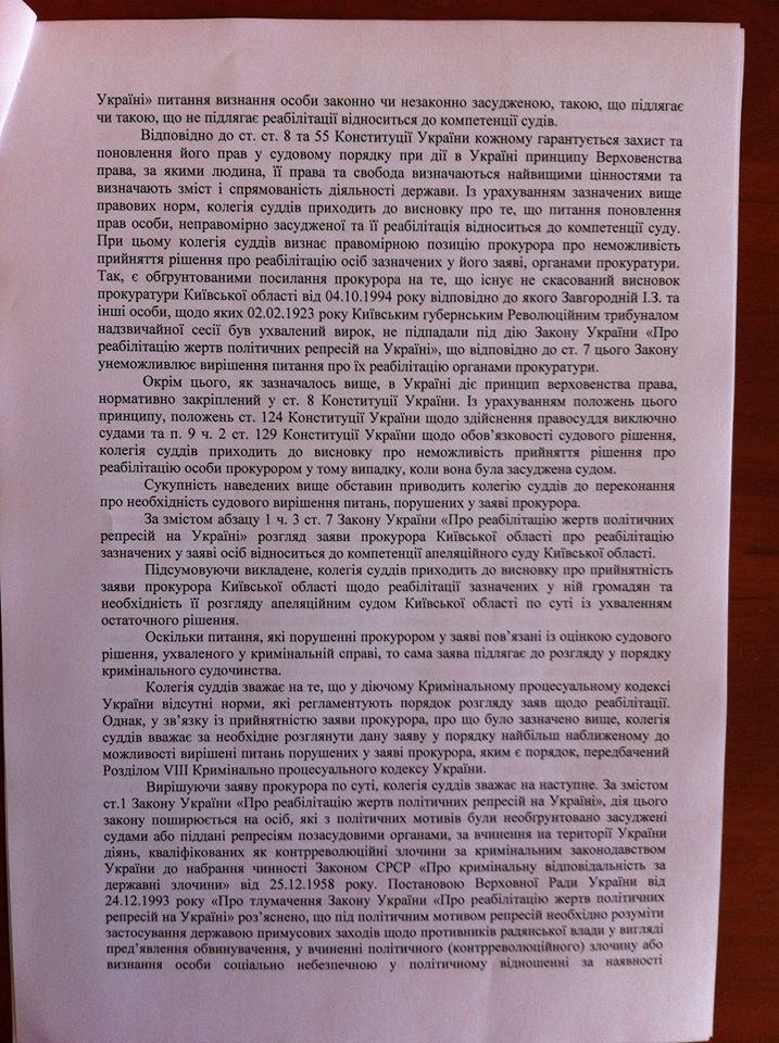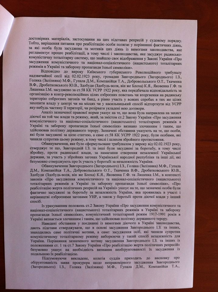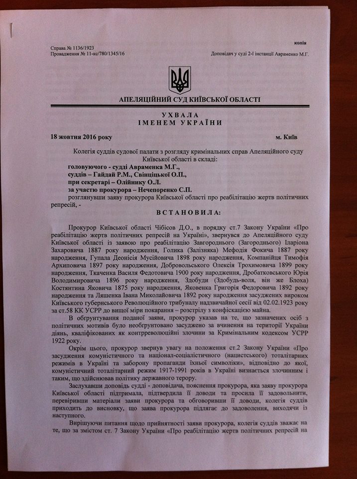 Апеляційний суд Київської області реабілітував лідерів Холодноярської республіки, які були засуджені та розстріляні в 1923 році.