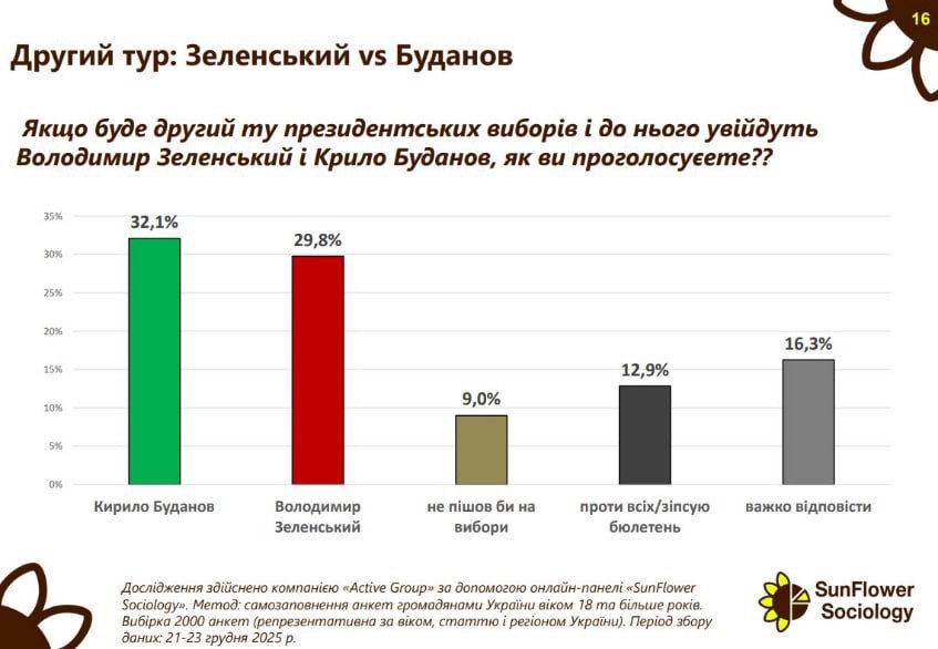 Він звертає увагу на показники начальника ГУР Кирила Буданова, який набирає 10,9% у першому турі і вже 32,1% у другому турі в парі із Володимиром Зеленським, перемагаючи чинного президента.