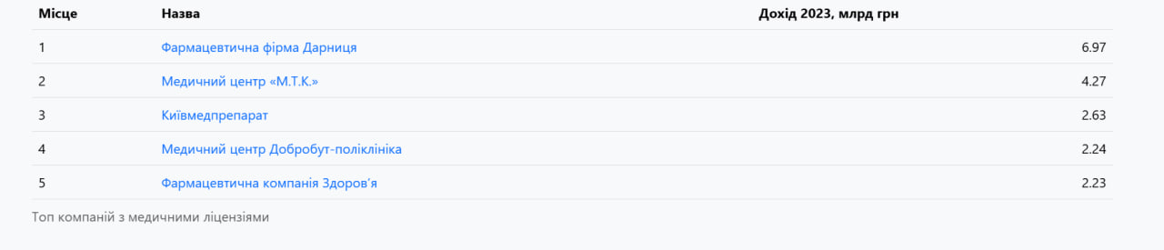 До переліку найбільших за доходом компаній, які мають ліцензії, потрапила велика кількість бізнесів, у яких медичний напрямок не є провідним. Переважно, йдеться про компанії, в яких відкритий медичний напрямок для їх співробітників, Так, наприклад, у топі компанія "Нібулон". Також у списку є "М.Т.К.", "Добробут-поліклініка", медична лабораторія "Діла", "Сінево Україна", "Дарниця", "Київмедпрепарат", "Здоров"я" та "Борщагівський хіміко-фармацевтичний завод".