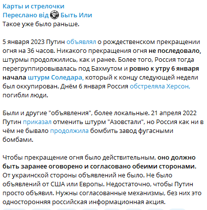 "Таке вже було раніше. 5 січня 2023 року Путін оголошував про різдвяне припинення вогню на 36 годин. Жодного припинення вогню не було, штурми продовжилися, як і раніше. Більше того, Росія тоді перегрупувалася під Бахмутом і рівно до ранку 6 січня розпочала штурм Соледара, який до кінця наступного тижня був окупований. Вдень 6 січня Росія обстріляла Херсон, загинули люди", - наголосив він.