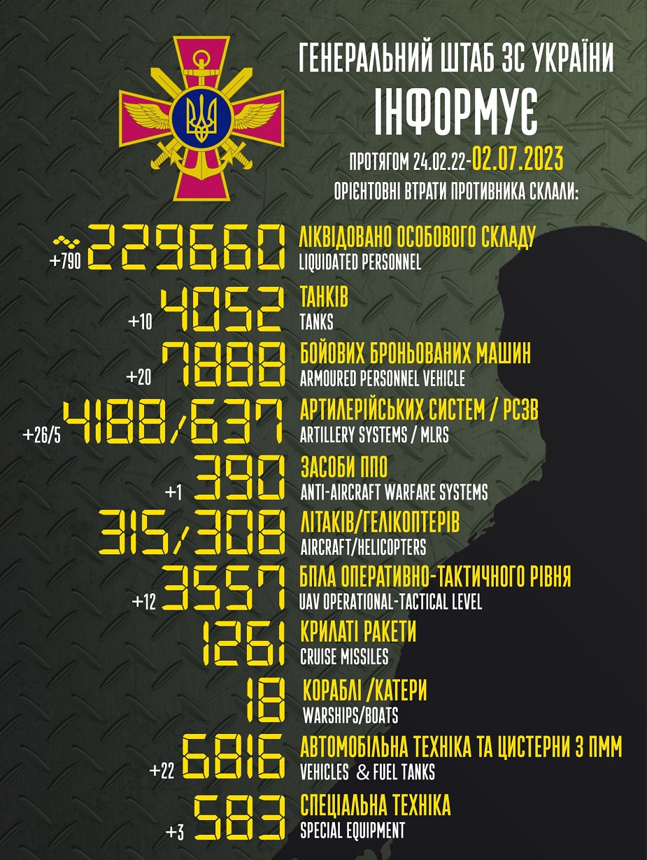 Так, загальні бойові втрати противника з 24.02.22 по 02.07.23 орієнтовно склали: