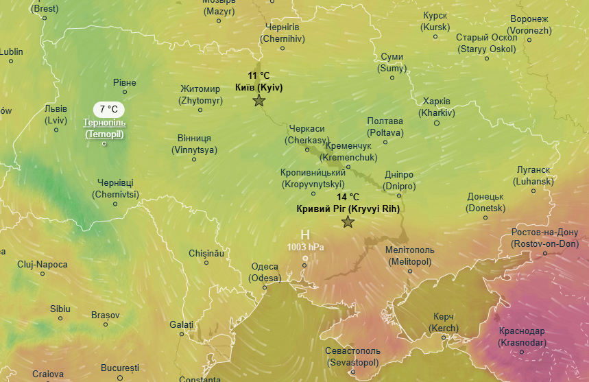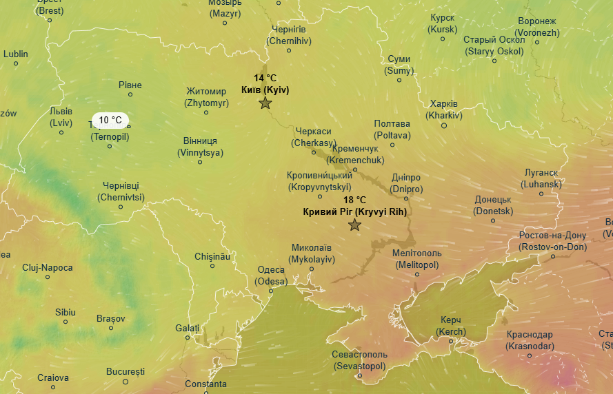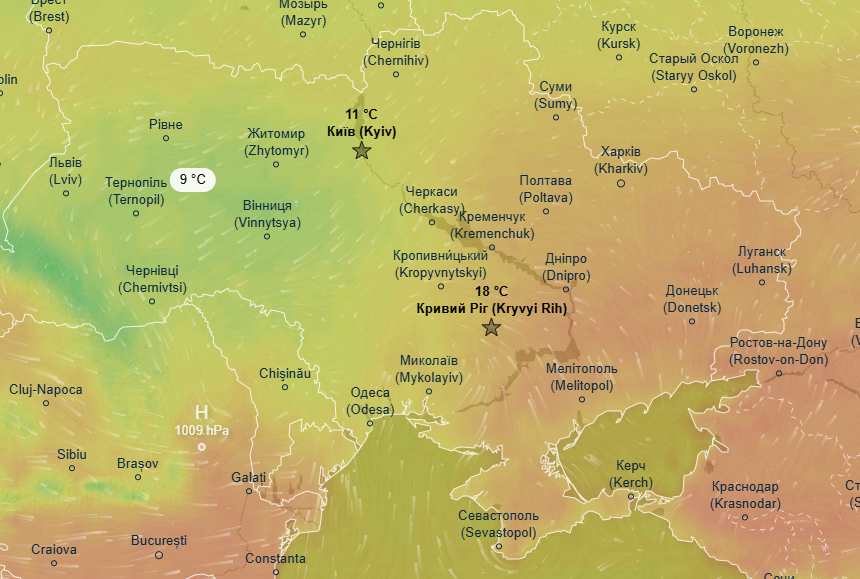 Вдень теплі повітряні маси зі сходу почнуть витісняти холодний атмосферний фронт і принесуть підвищення температури до +20... +23 градусів на сході та на півдні, потепліє і на Сумщині, Полтавщині та Харківщині. Епіцентром холоду у п'ятницю залишиться Вінниччина, Тернопільщина та Карпати, де очікується до +9 градусів вдень.