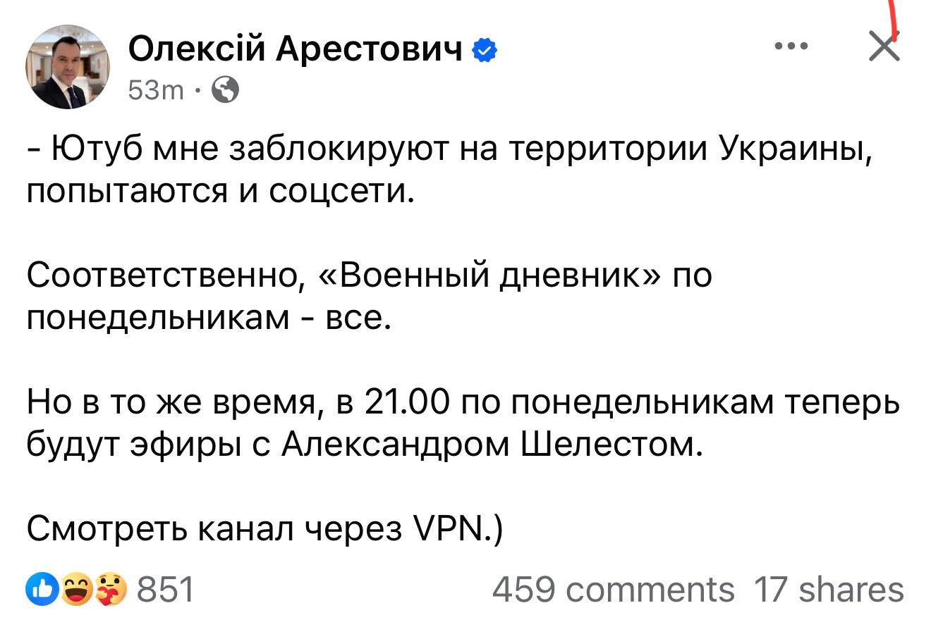 "Арестович тепер буде вєщати з росії, через vpn. Давно було пора його заблокувати", - написав колишній міністр.
