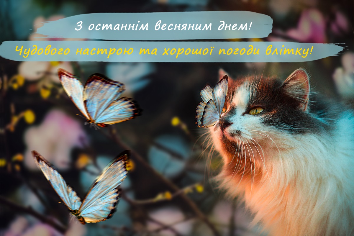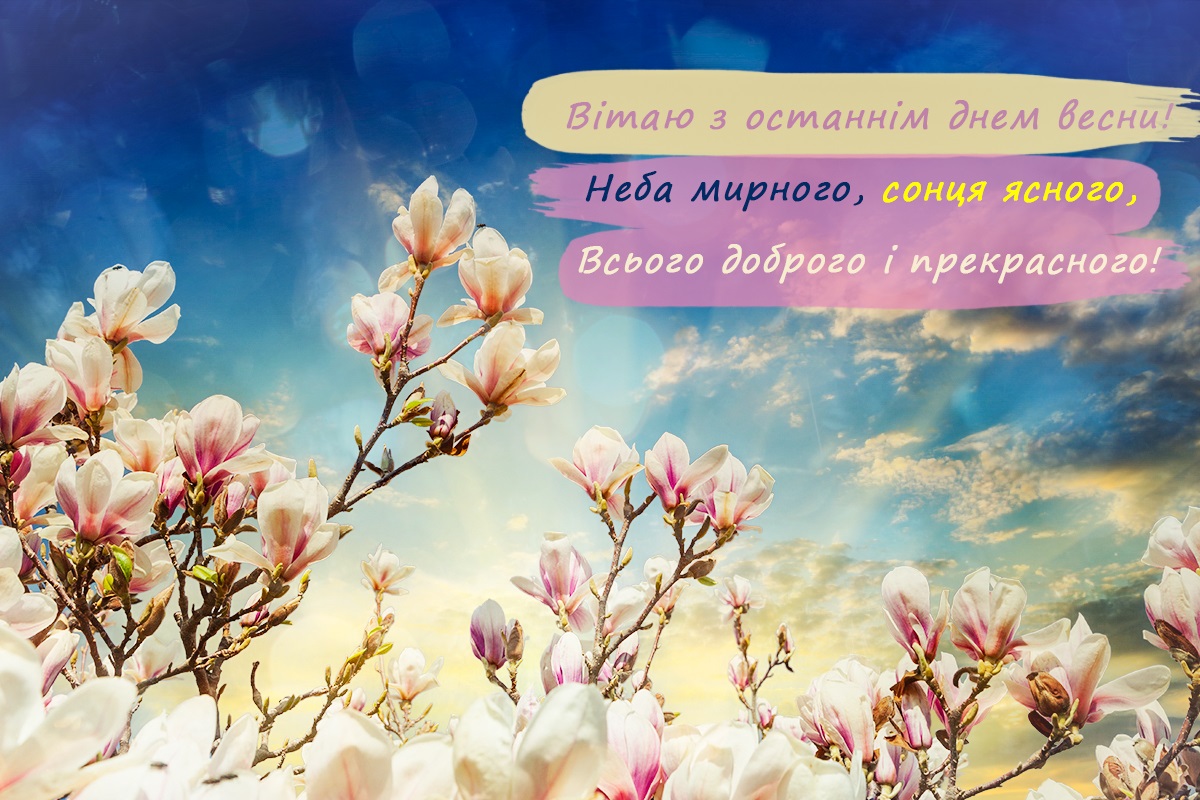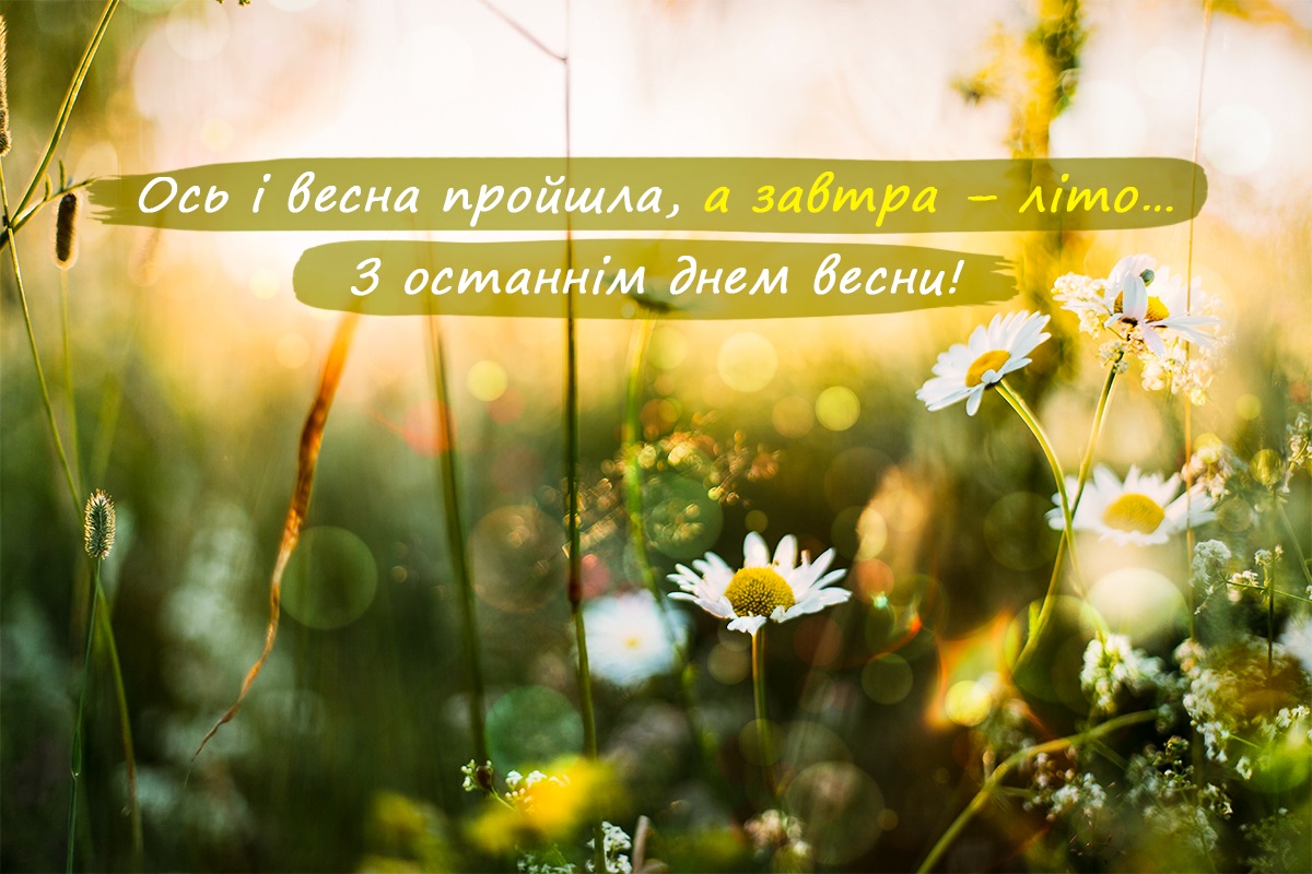 З останнім днем весни! Бажаю, щастя та удачі, бажаю дружби та любові, нехай радують тебе надії, нехай збудуться твої мрії! Нехай літо принесе нам щастя та благополуччя, а Україні – перемогу та довгоочікуваний мир!