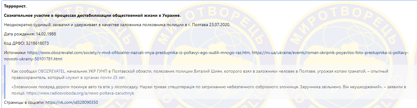 Підставою для внесення до бази даних "Миротворця" Романа Скрипника зазначено: "Терорист. Свідома участь в процесах дестабілізації суспільного життя в Україні"