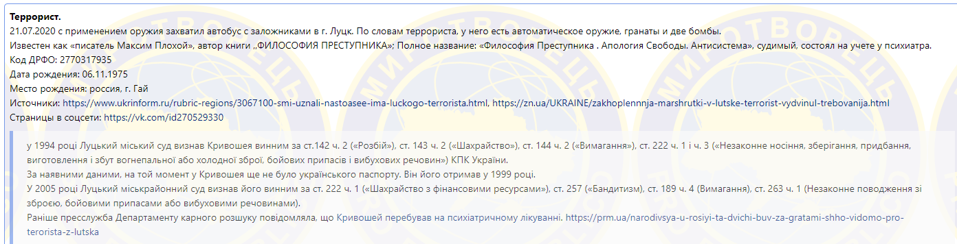 База даних сайту "Миротворець" поповнилася інформацією про Максима Кривоша, який 21 липня в Луцьку захопив автобус з пасажирами, і Романа Скрипника, який в Полтаві захопив в заручники полковника поліції Віталія Шияна.