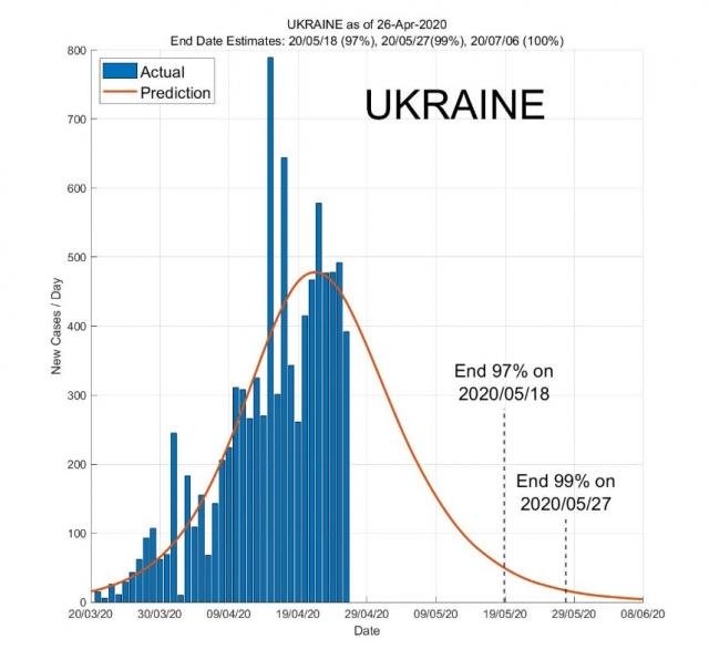 На підставі аналізу статистичних даних, сінгапурські вчені розрахували, що до 18 травня ситуація з поширенням вірусу в Україні покращиться на 97% в порівнянні з піком, до 28 травня - на 99%, а остаточно пандемія завершиться 7 липня.