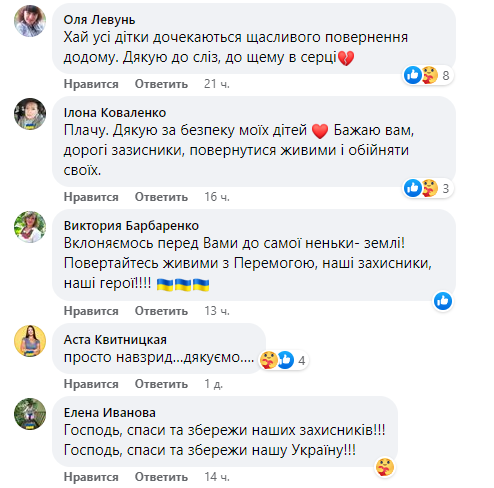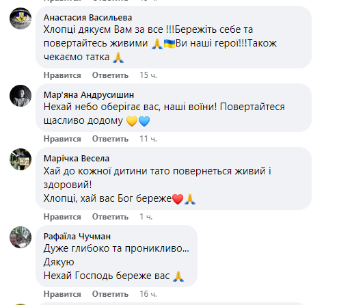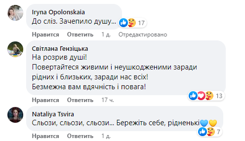 "Дякую. По-справжньому", "До сліз. Зачепило душу...", "На розрив душі! Повертайтеся живими і неушкодженими заради рідних і близьких, заради всіх нас! Безмежна вам подяка і повага!", "Сльози, сльози, сльози... Бережіть себе, рідні", - пишуть коментарі.