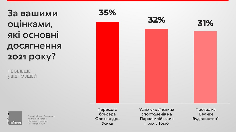 Боксерський тріумф Усика назвали найбільшим досягненням 35% опитаних, виступ паралімпійців – 32%, програму президента "Велике будівництво" – 31%.