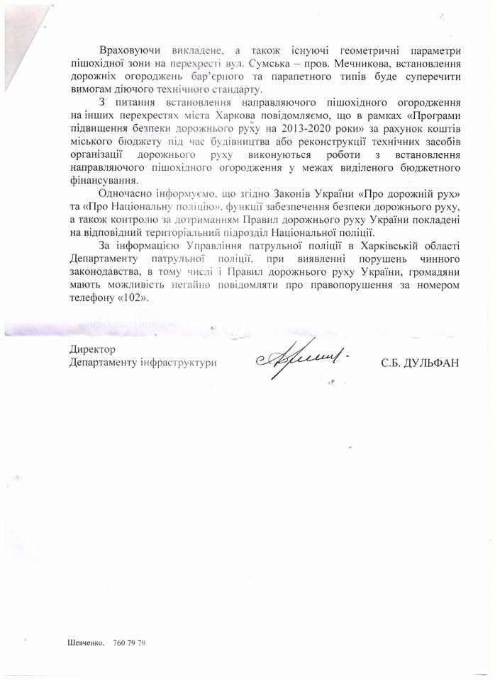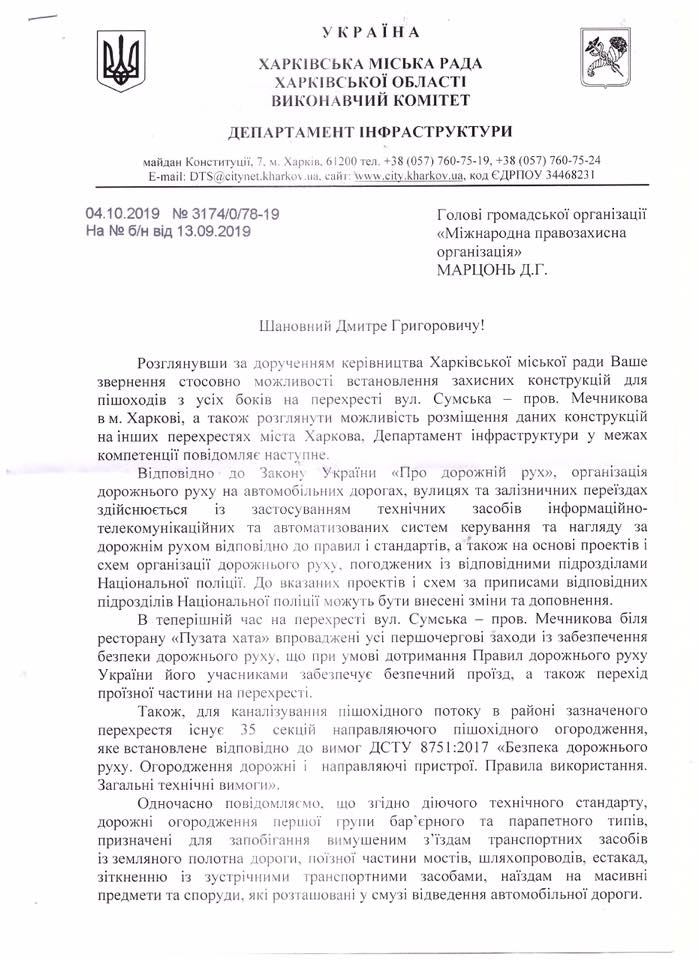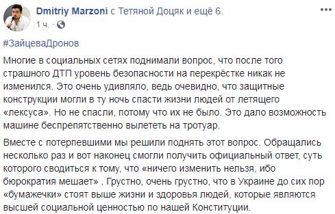 Він опублікував фотографії відповіді на його запит про те, щоб встановити на перехресті захисні конструкції, які могли б уберегти людей від повторення трагедії. У ній наголошується, що встановлення конструкцій такого типу було б "порушенням вимог чинного технічного стандарту".