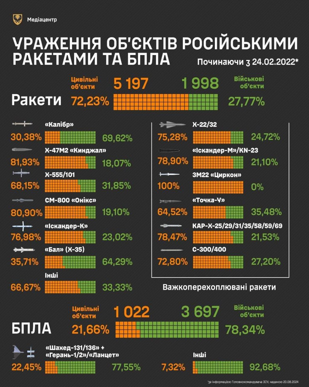 Відповідно до даних статистики, з початку повномасштабної війни російські окупаційні війська цілили крилатими, балістичними та аеробалістичними ракетами по 72,23% цивільних об'єктів. Найчастіше для терористичних ударів по українських містах Росія використовує, згідно з даними, ракети "Кинджал", "Онікс", "Циркон", "Іскандер-М" та "Іскандер-К", а також С-300/400.