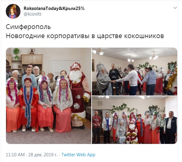 "Новорічні корпоративи в царстві кокошників", - йдеться у підписі до знімків, на яких учасники корпоративу дійсно стоять в кокошниках.