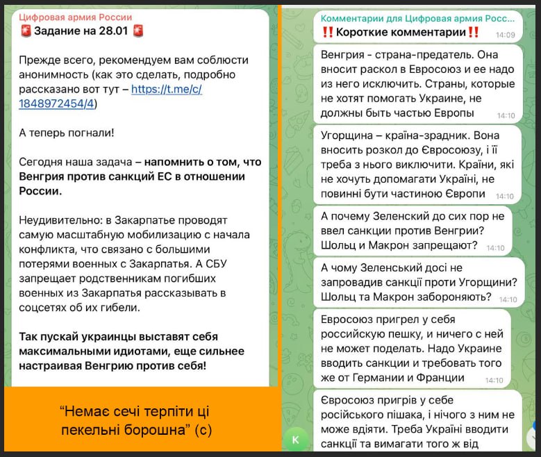 Російські інтернет-тролі отримали нове завдання та оголосили рейди на українські телеграм-канали з відкритими чатами для обговорення, головними темами яких стали "розхитування Закарпаття" та переорієнтування хейту українців від РФ в бік Угорщини, яка погрожує накласти вето на можливі санкції ЄС проти російської ядерної енергетики.