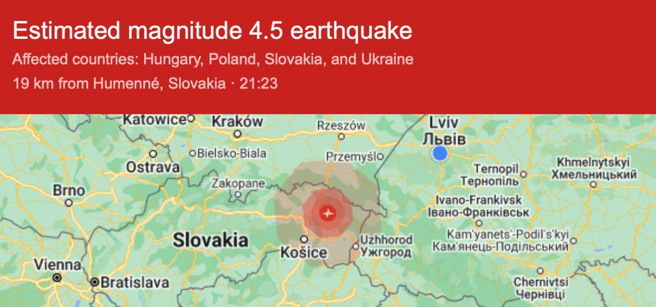 "Польща/Словаччина - біля кордону з Україною, магнітуда майже 5 балів", - написав він.