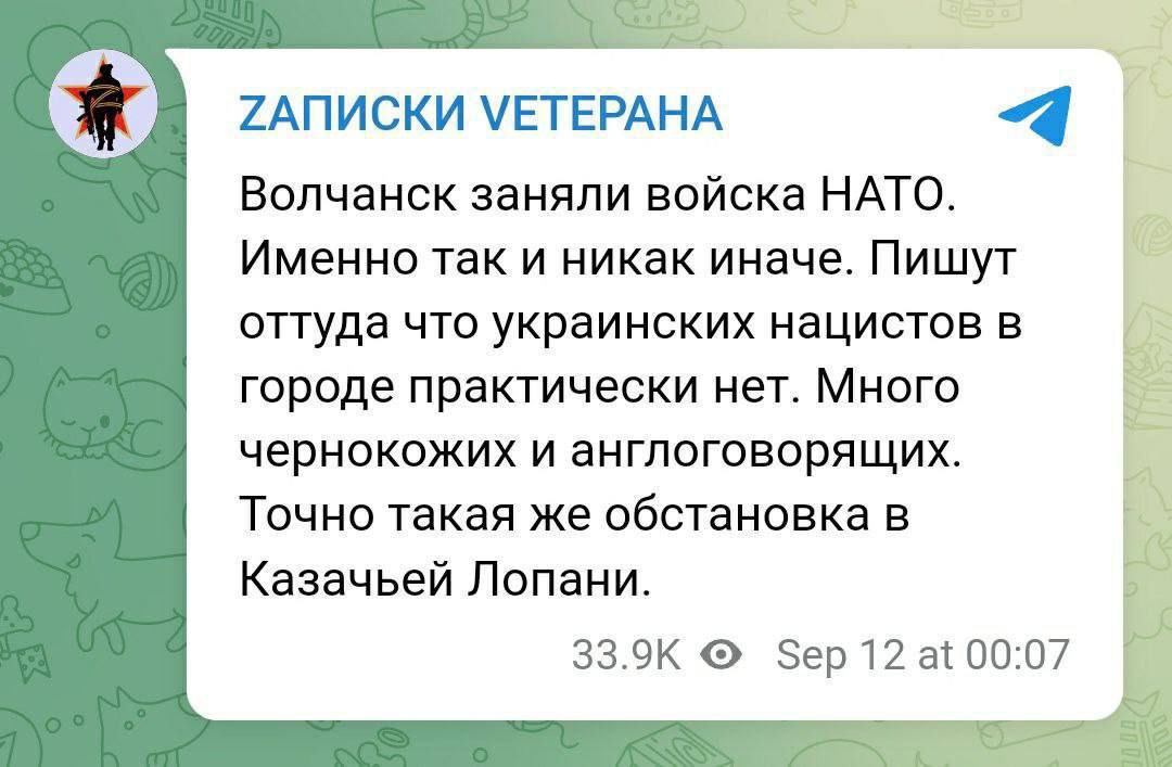 "Вовчанськ зайняли війська НАТО. Саме так і ніяк інакше. Пишуть звідти, що українських нацистів у місті практично немає. Багато чорношкірих та англомовних. Така сама ситуація у Козачій Лопані", - пишуть пропагандисти.