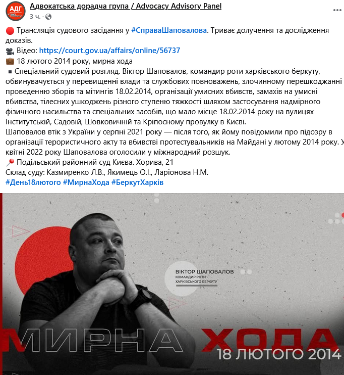 "18 лютого 2014 року, мирна хода. Спеціальний судовий розгляд. Віктор Шаповалов, командир роти харківського беркуту, обвинувачується у перевищенні влади та службових повноважень, злочинному перешкоджанні проведенню зборів та мітингів 18.02.2014, організації умисних вбивств, замахів на умисні вбивства, тілесних ушкоджень...", - йдеться у повідомленні.