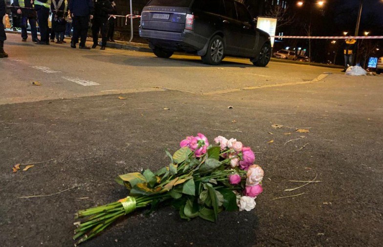 Після стрілянини по автомобілю депутата Київоблради В'ячеслава Соболєва, де трагічно загинув його маленький син, на місці злочину з'явився букет квітів - рожевих і білих троянд.