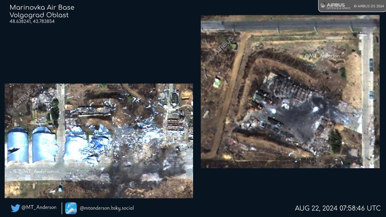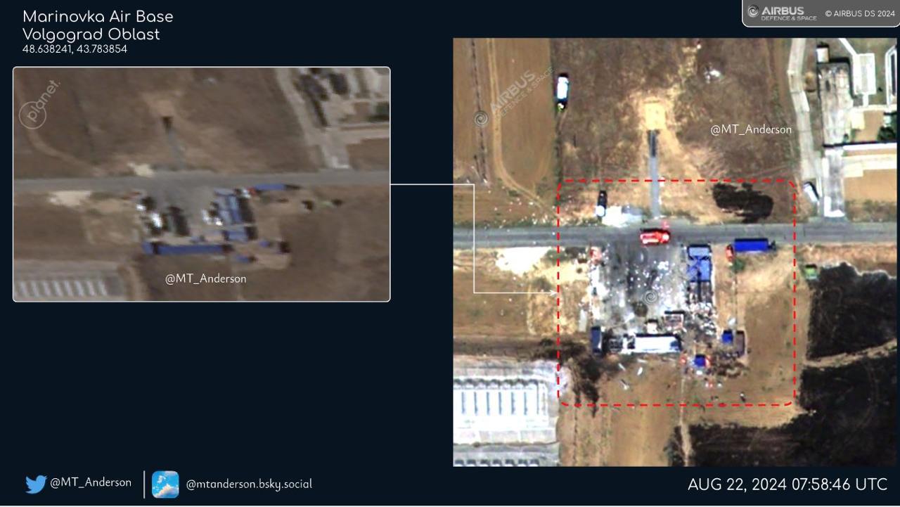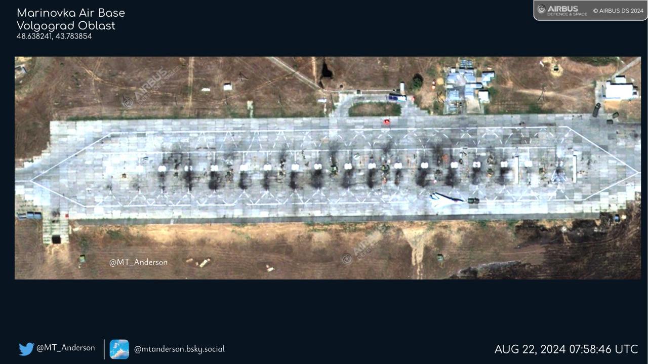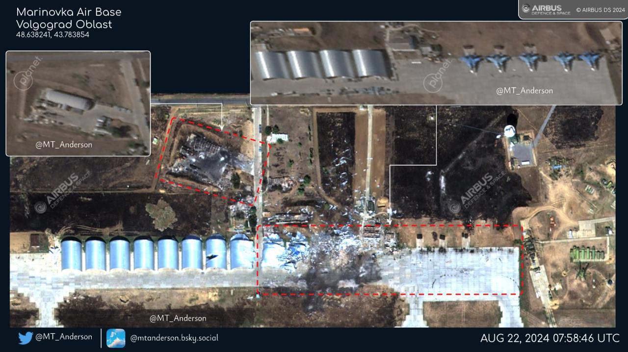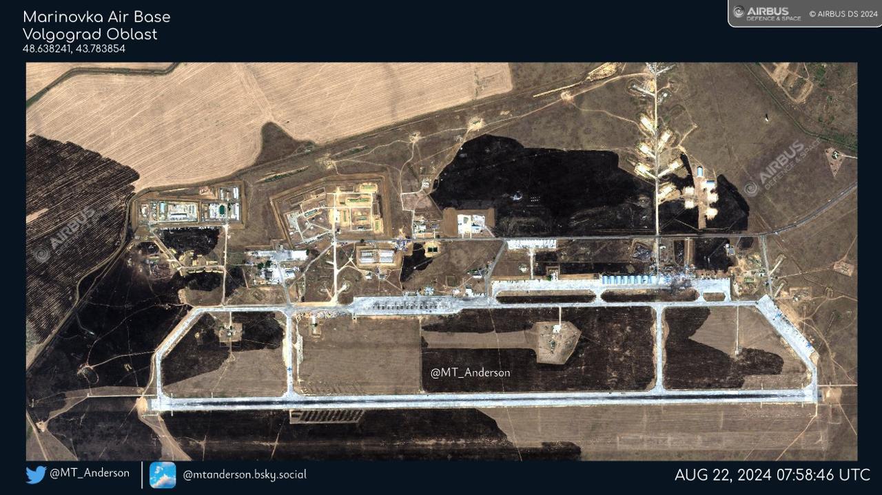 У мережі показали супутникові знімки з руйнуваннями на військовому аеродромі "Маринівка" у Волгоградській області, який у ніч на 22 серпня атакували українські безпілотники.