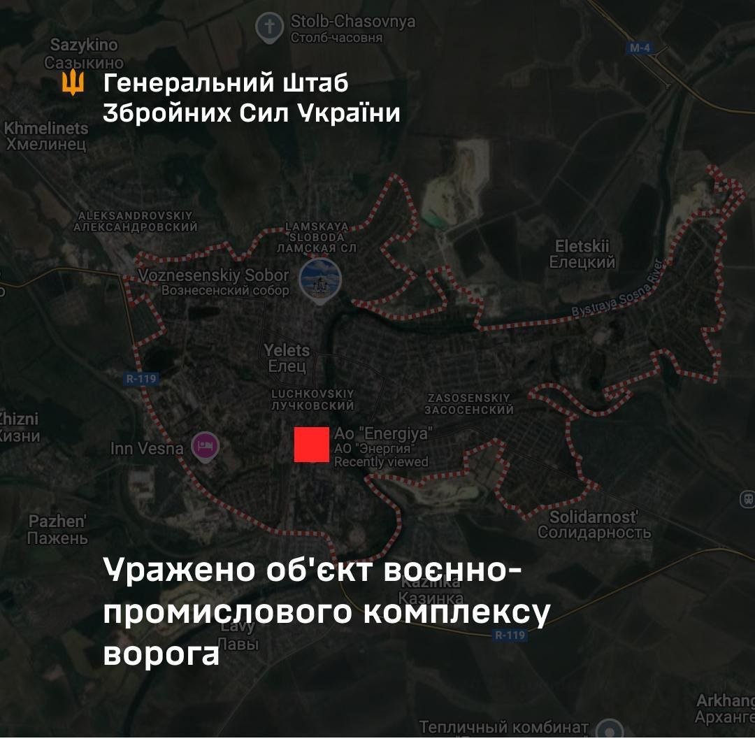 У Генеральному штабі підтвердили удар українськими дронами по заводу в місті Єлець Липецької області РФ 3 липня. Йдеться про важливий об'єкт воєнно-промислового комплексу.