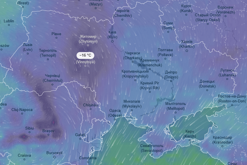 Ніч на неділю, 9 лютого, буде найхолоднішою - морози триматимуться на всій території нашої країни, а найсильніші - до -16 градусів - вдарять на Вінниччині та Житомирщині. Дещо спадуть морози у центрі країни та на півдні - до -5 градусів вночі.