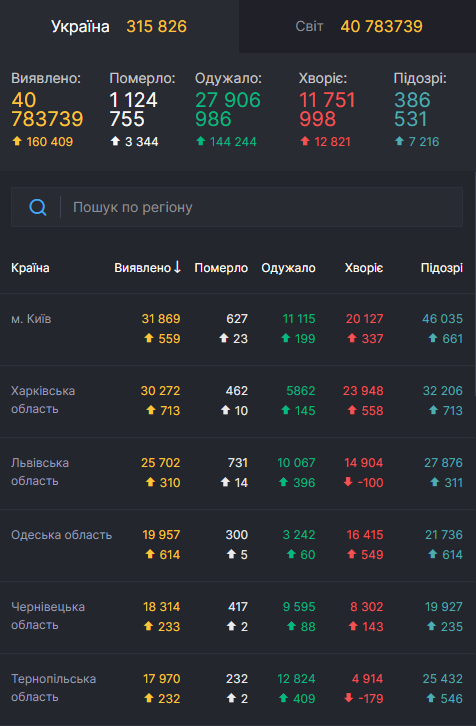 У середу, 21 жовтня, в Україні, окрім найбільшого числа виявлених нових випадків коронавірусу за добу, встановлено ще один антирекорд - по смертності внаслідок COVID-19. Так, минулої доби коронавірус забрав життя 141 українця, всього померлих від COVID-19 в Україні - 5 927 осіб.