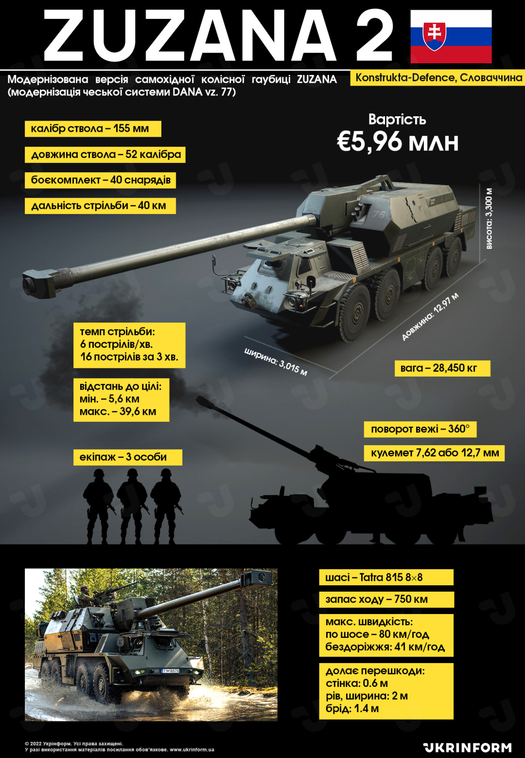 САУ Zuzana 2 - самохідна артилерійська установка, яка оснащена гарматою калібром 155 міліметрів. Словацьке озброєння побудовано колісному шасі Tatra T815 8х8. Оновлена гармата дозволяє САУ Zuzana 2 відкривати вогонь на відстань до 41 кілометра - далекобійність перевищує показники найкращої російської установки 2С5М "Гіацинт" майже на 5 км.