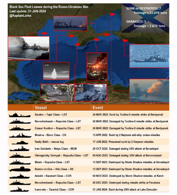 Загалом налічується 11 кораблів, що були знищені чи пошкоджені українською стороною. Також до списку потрапив у 2024 році ракетний катер "Івановєц".