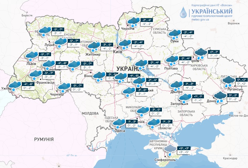 Температура у західних областях вночі 4-9° морозу, вдень 0-5° морозу; у північних і центральних областях вночі та вдень 2-7° морозу; на решті території впродовж доби від 4° морозу до 2° тепла, в Криму 1-6° тепла.