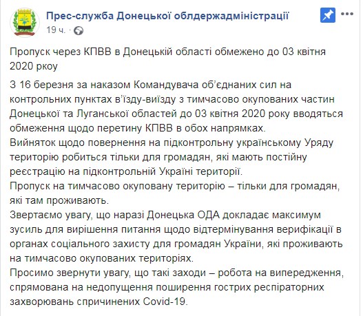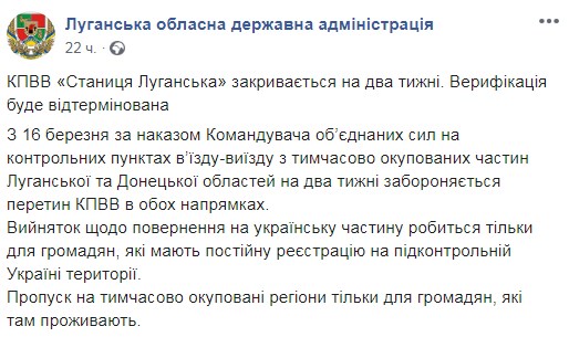 "КПВВ в Донецькій області припиняють роботу до 3 квітня, єдиний пункт пропуску в Луганській області ("Станиця Луганська") - на два тижні", - йдеться в повідомленні.
