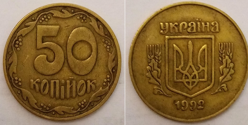 50-копійчана 1992 року штамп 2.1БАм вважається дуже рідкісною - таку знаходили тільки кілька разів. Її особливістю є те, що на лицьовій стороні перше гроно має п'ять ягід, а третє - чотири ягоди. Крім того, є відмінності в товщині герба, зернах і формі листя, пише "РБК-Україна".