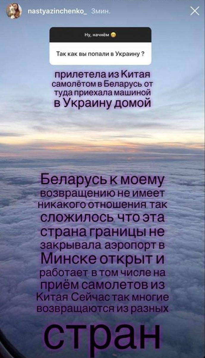 "Прилетіла з Китаю літаком до Білорусі, звідти приїхала машиною в Україну додому", - розповіла Анастасія.
