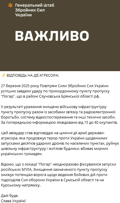 За даними Генштабу, Повітряні Сили ЗСУ успішно завдали удару по прикордонному пункту пропуску "Погар" в районі Случовська.