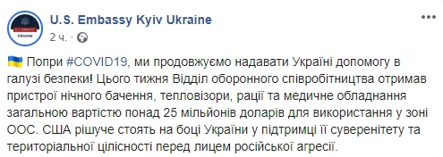 "Не дивлячись на COVID-19, ми продовжуємо надавати Україні допомогу в області безпеки! На цьому тижні Відділ військового співробітництва отримав пристрої нічного бачення, тепловізори, рації та медичне обладнання загальною вартістю понад 25 млн доларів для використання в зоні ООС. США рішуче стоять на стороні України в підтримці її суверенітету і територіальної цілісності перед лицем російської агресії ", - йдеться в публікації.
