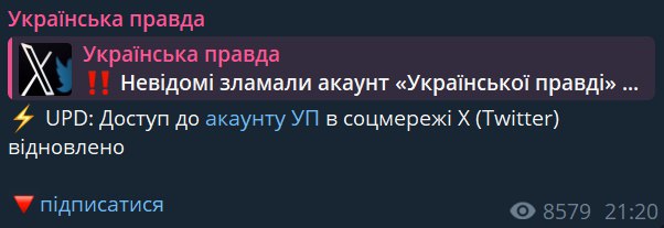 "Ми намагаємося відновити доступ. Просимо не рахувати опубліковану в соцмережі інформацію, що має стосунку до УП", - йдеться в заяві видання.
