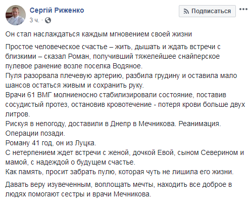 "Як пам'ять, просить забрати кулю, яка ледь не позбавила його життя", - написав Риженко.