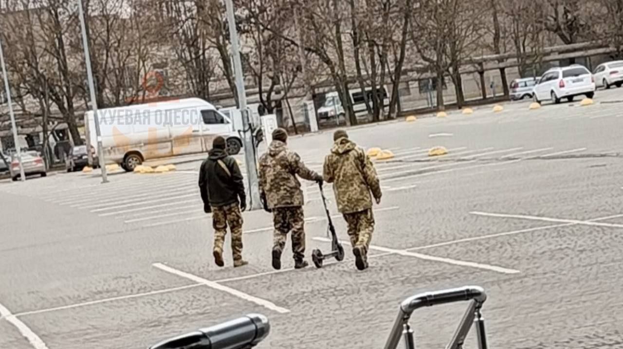 Кадри зняли місцеві жителі із вікна одного з будинків. На них п'ятеро чоловіків у військовій формі їдуть на популярному сучасному транспорті. У соціальних мережах пожартували про роздачу повісток на нових швидкостях.