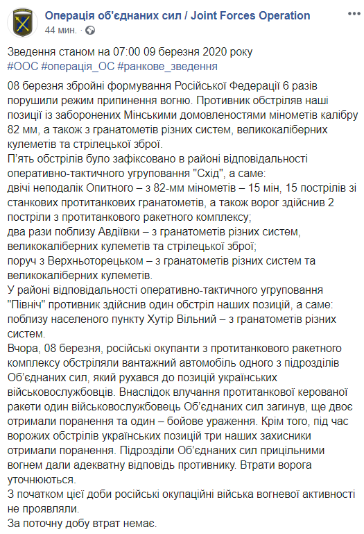 У штабі додали, що російські окупанти з протитанкового ракетного комплексу обстріляли вантажний автомобіль одного з підрозділів Об'єднаних сил, який рухався до позицій українських військовослужбовців. Внаслідок попадання протитанкової керованої ракети один боєць ЗСУ загинув, ще двоє отримали поранення і один - бойове ураження.