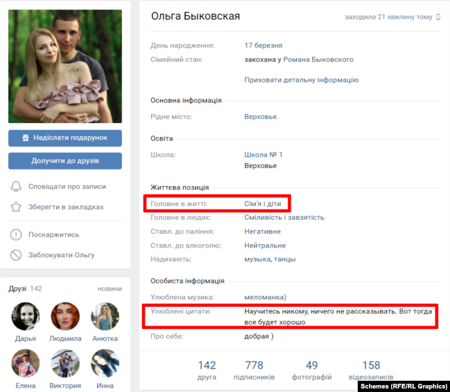 "Героями" розмови була сімейна пара Романа та Ольги Биковських, що після окупації Росією Криму перебрались у Феодосію. Вони мають 5-річного сина. У російській соцмережі "Вконтакте" жінка, яка радила чоловіку ґвалтувати "українських баб", вказала, що головне в житті для неї це "сім'я та діти", а її життєвим кредом є "Навчіться нікому нічого не розповідати. Ось тоді все буде добре". Зауважимо, що окупантська дружина хоч і радила ґвалтувати, але просила не розповідати їй про це. Вочевидь, дійсно слідує своїм заповідям.