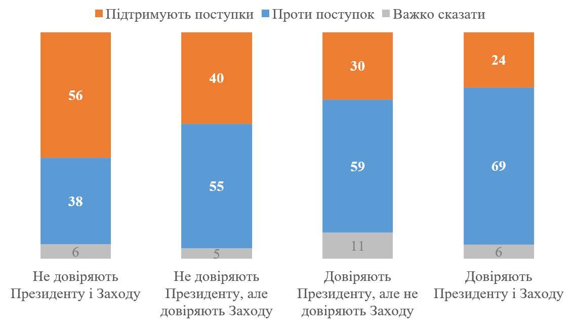 А ось найменше готові до поступок ті, хто зберігають і довіру президенту, і довіру Заходу. Серед них 69% категорично проти поступок (проти 24%, які готові до територіальних поступок).