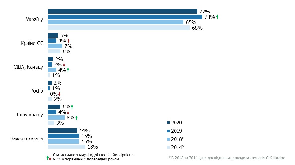 В ході щомісячного опитування Омнібус Info Sapiens, яке було проведено у липні 2020 року, 72% українців старше 16 років заявили, що якби в них була можливість вибирати країну, в якій народитися, то вони обрали б Україну. Як зазначили ініціатори опитування, цей показник не змінився у порівнянні з 2019 роком, однак вминулі роки був вищим (65% - у 2018 р., 68% - у 2014 р.).