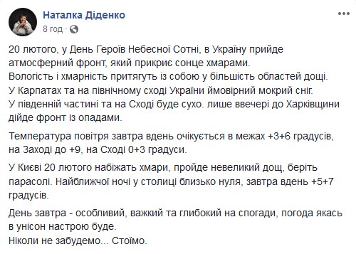 У середу, 20 лютого, в День героїв Небесної сотні, в Україні буде хмарна погода, а у більшості областей очікується дощ.
