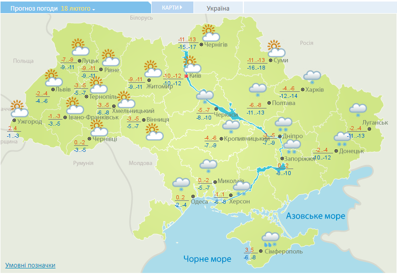 У Києві 18 лютого, за даними Діденко, серйозні опади малоймовірні. На дорогах буде слизько. Вночі та вдень температура повітря буде приблизно однаковою - 10-12 градусів морозу. На вечір похолодає до -16-18 градусів.