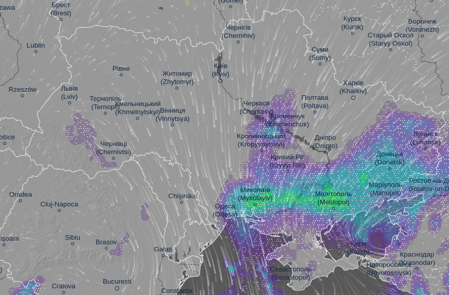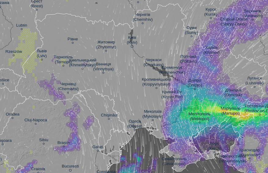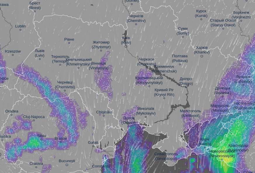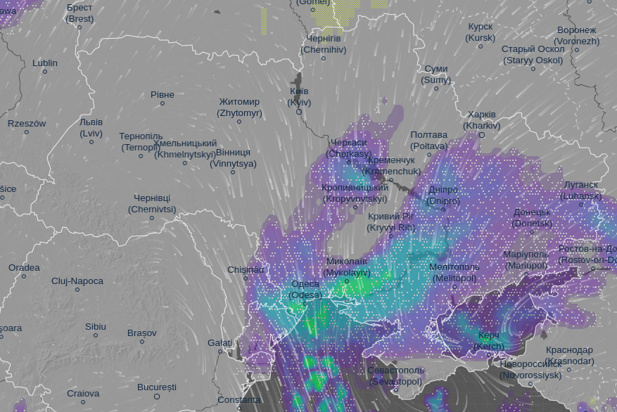 Увечері у понеділок на Заході та Півночі України буде без опадів, а снігопади синоптики прогнозують у всіх південних та східних регіонах, а також у Черкаській, Кіровоградській, Полтавській та Харківській областях.