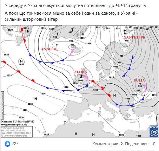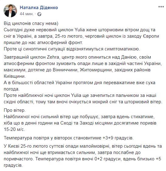 Про це повідомила на Facebook-сторінці синоптик Наталка Діденко.