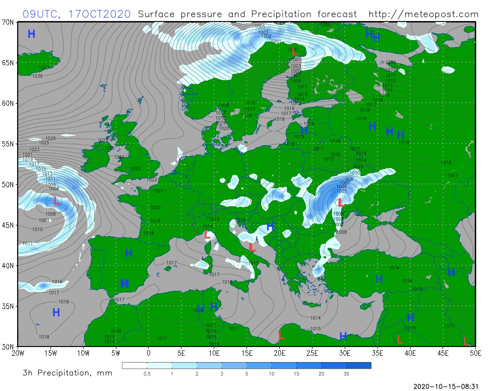 Вже в суботу, 17 жовтня, в країну прийде циклон з південного заходу, який принесе вже сильні дощі і поривчастий вітер на Півночі, Заході та місцями в центральних областях. Сухо буде в східних і південних областях. Там похолодає 18-19 жовтня. Ймовірність опадів в суботу залишиться в Харківській області.